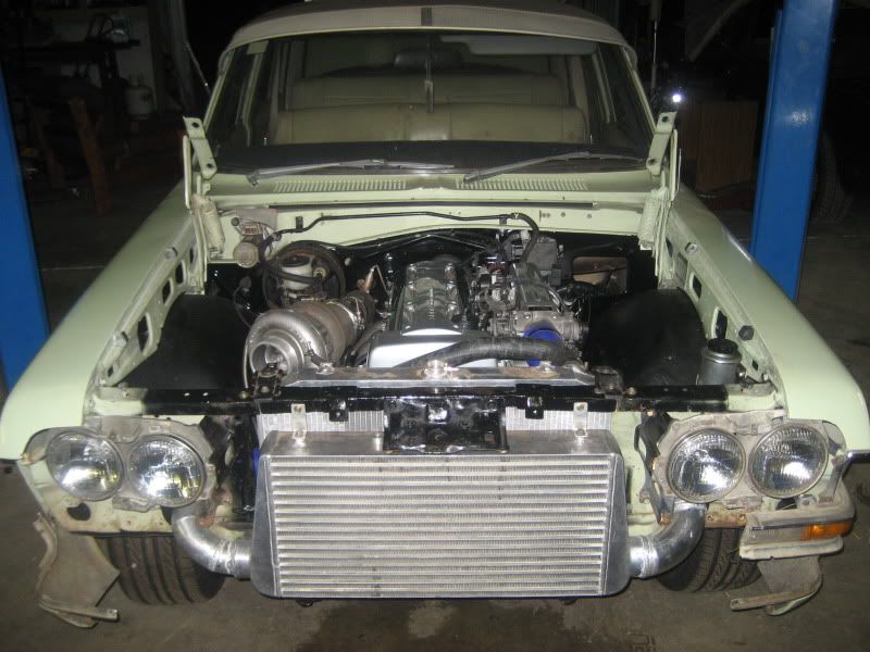 Mounted and plumbed up the auto cooler and filter and bolted the front of the car back on. Filled it with ATF and water and fired it up. Got gears and drive. Check. Got 2JZ powahz. Check. Got Steering column and wheel. Negative, the pattern is full.