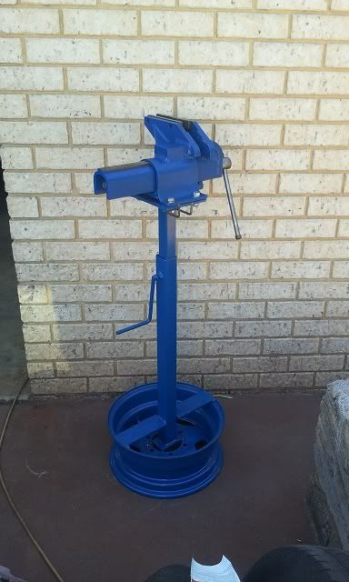 Might be an idea to keep all this stuff together so it's all currently accessible? Anyway here is my modest contribution, a home made wheel lifter for those awkward big wide wheels. Made from a kids bike fork and office chair caster wheels. Place the wheel on top, position it, line the wheel stud holes up and roll the wheel on.